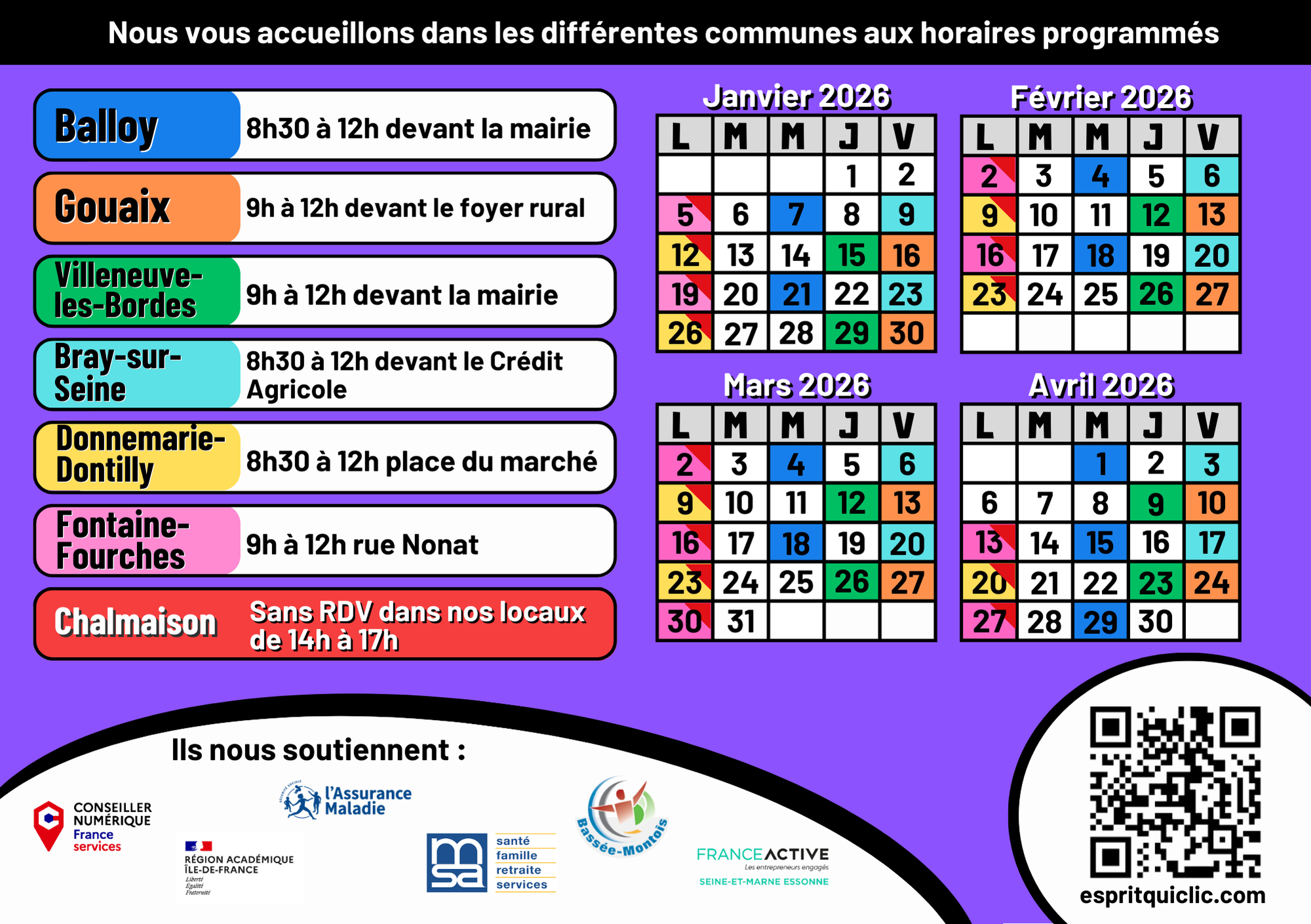 Calendrier de Janvier à Avril 2026 ( cliquer pour zoomer )